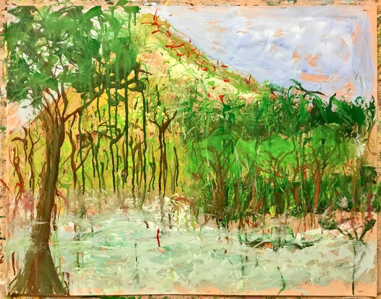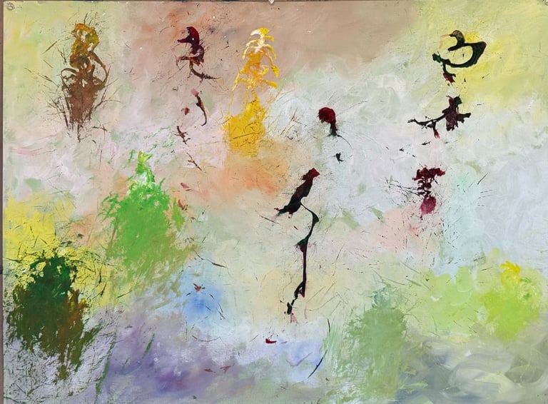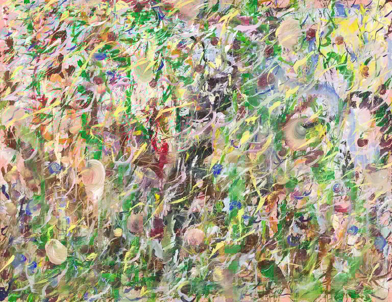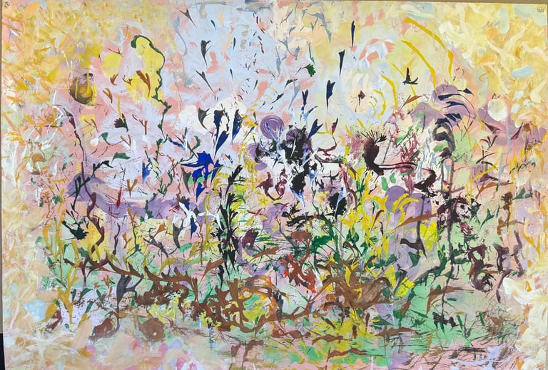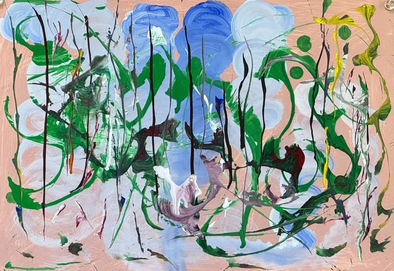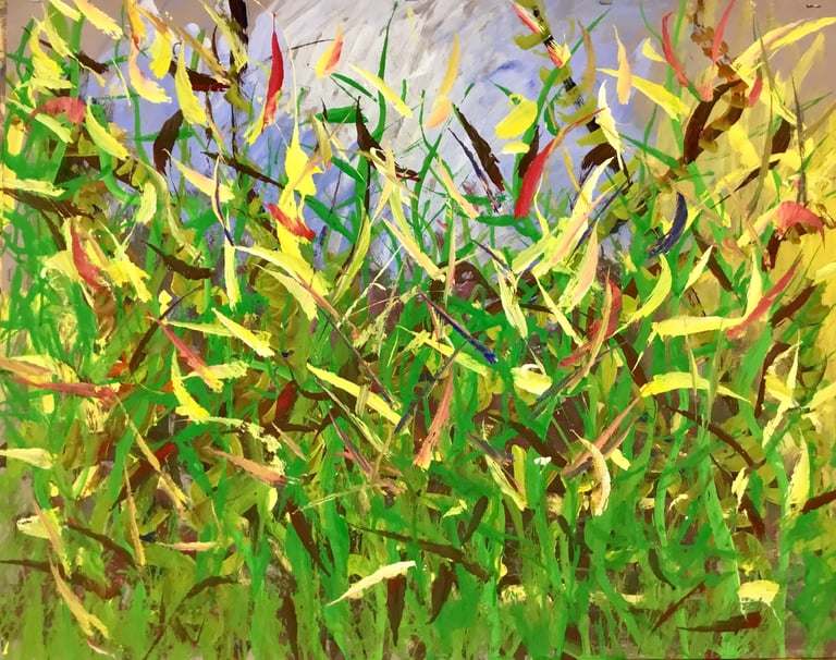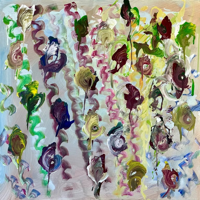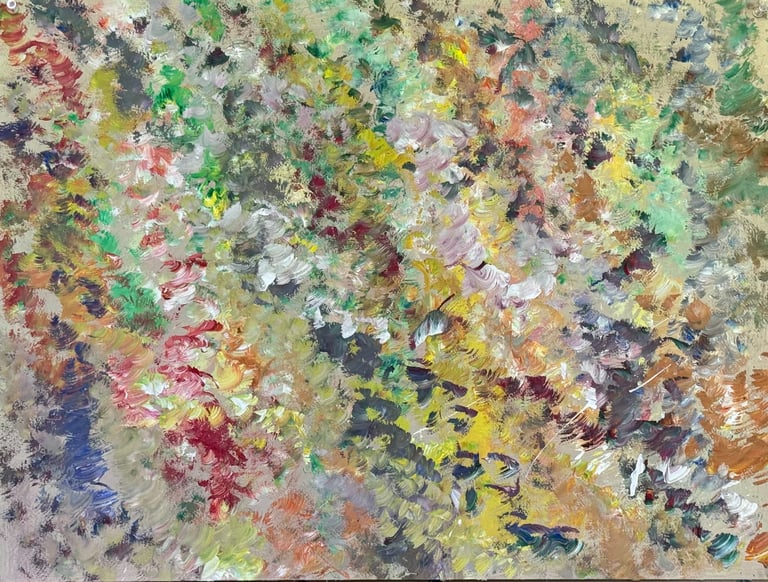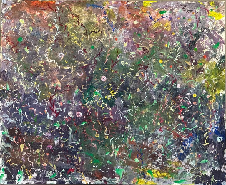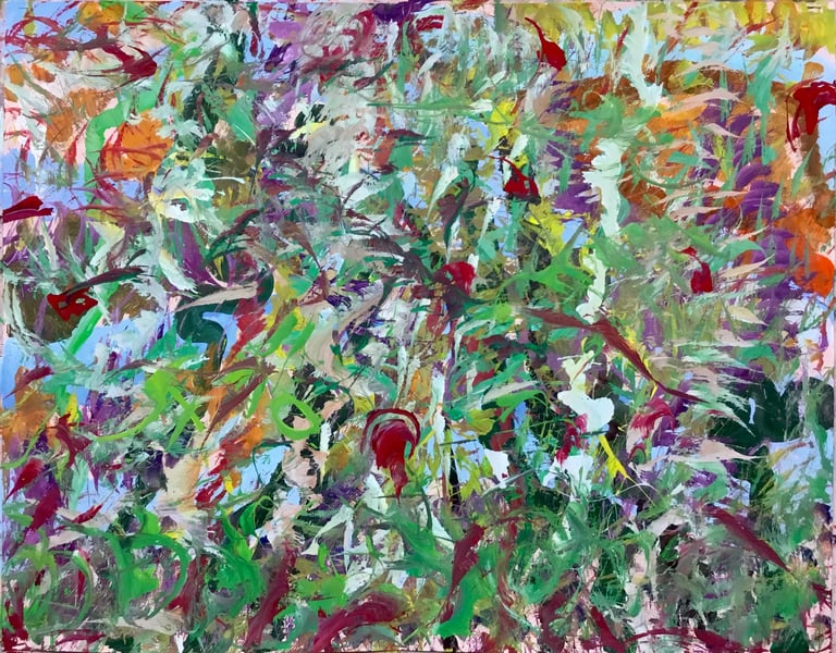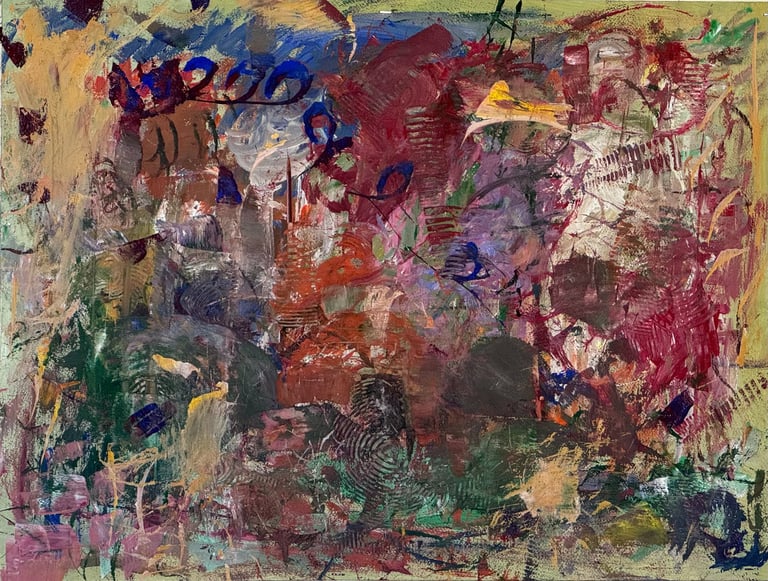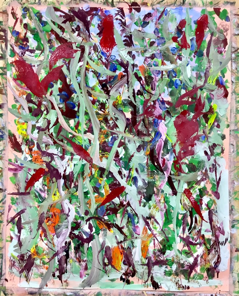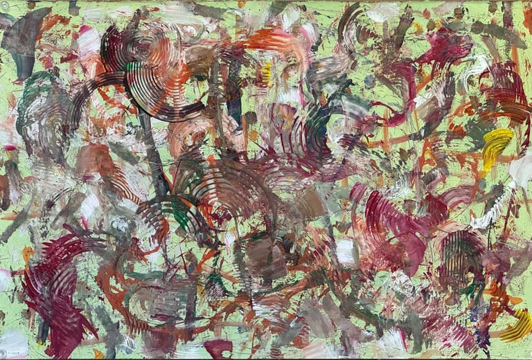 Over the past few years, I have begun to apply this practice of time-limited painting to improvisational music in my personal artmaking outside of work. While I sometimes listen to music I have selected because of its improvisational nature, I most enjoy painting with improvisational musicians in real life and am always in search of collaborative opportunities with such artists. When I paint to music I am familiar with, I can focus on the rhythm and beat, but it is most exciting and interesting for me to paint to music I have never listened to before, because of the unknown, unanticipated nature of where the music is going. The added benefit of live collaboration is how my painting can also influence the music I am hearing. In 2024, I began teaching workshops and classes on "Expressive Painting to Music" with my musician colleague and friend, David Smith, at the Arkansas Museum of Fine Arts. This improvisational “paint to music” practice is a form of meditation for me. It helps me to overcome the distraction of my thoughts and my constant concern about the problems of the complex world we live in. When I am making these pieces, I am completely in the moment, responding to what I hear. This practice has given me a new way to express my creative impulses.