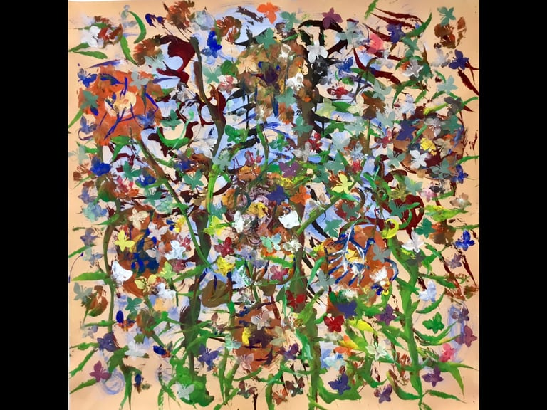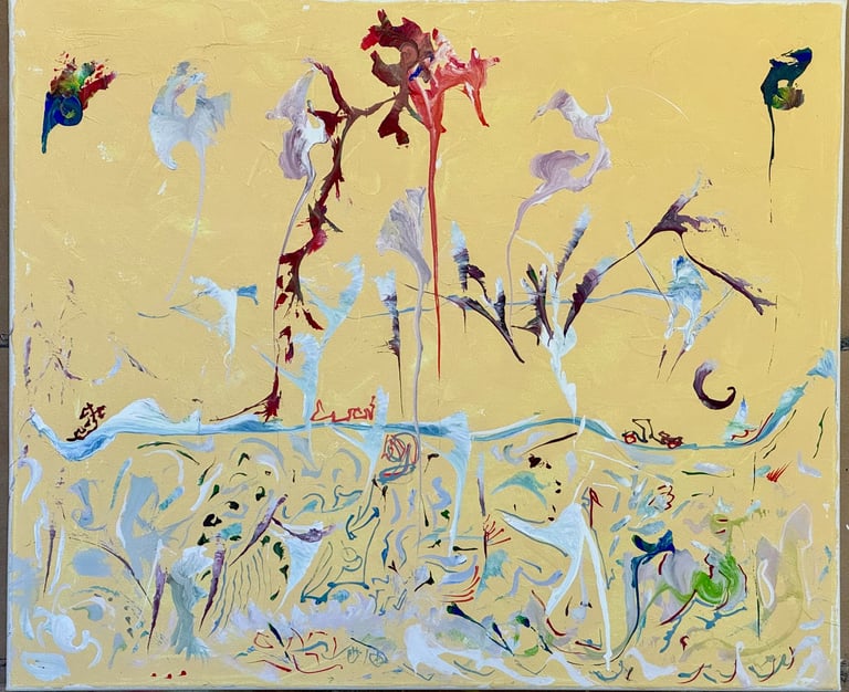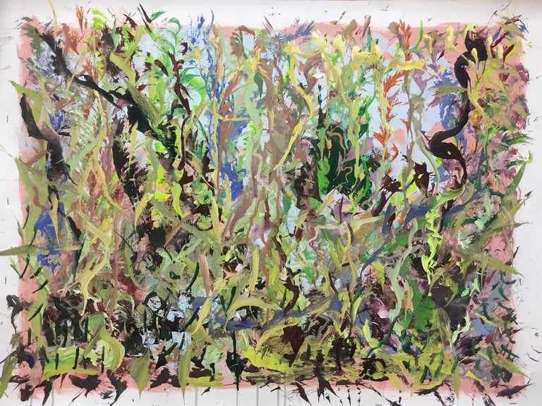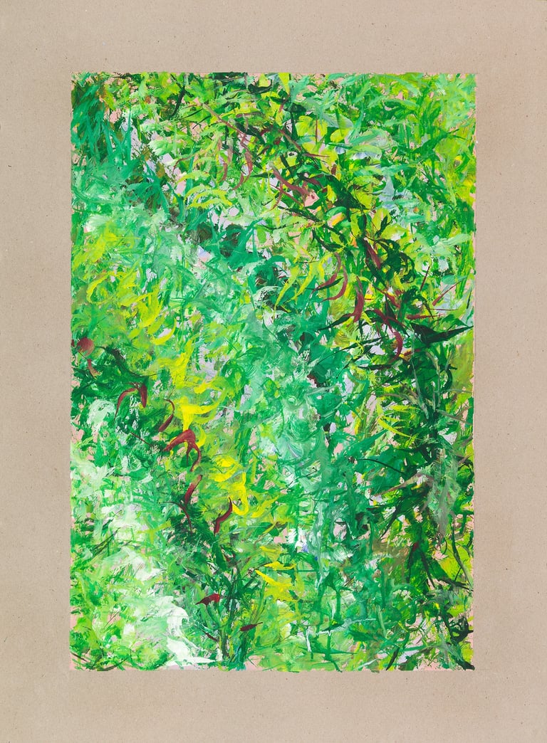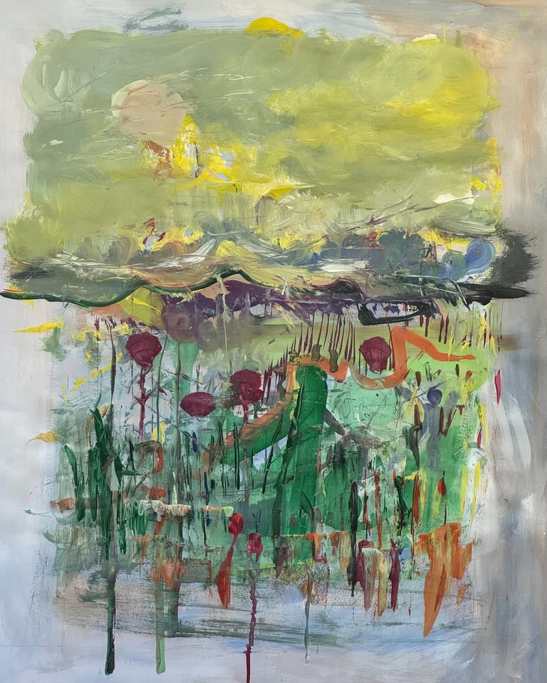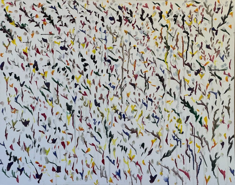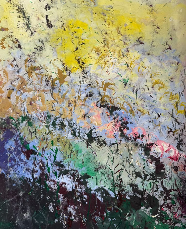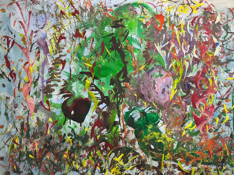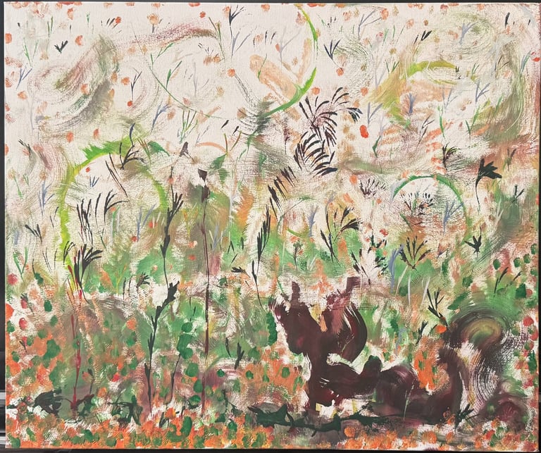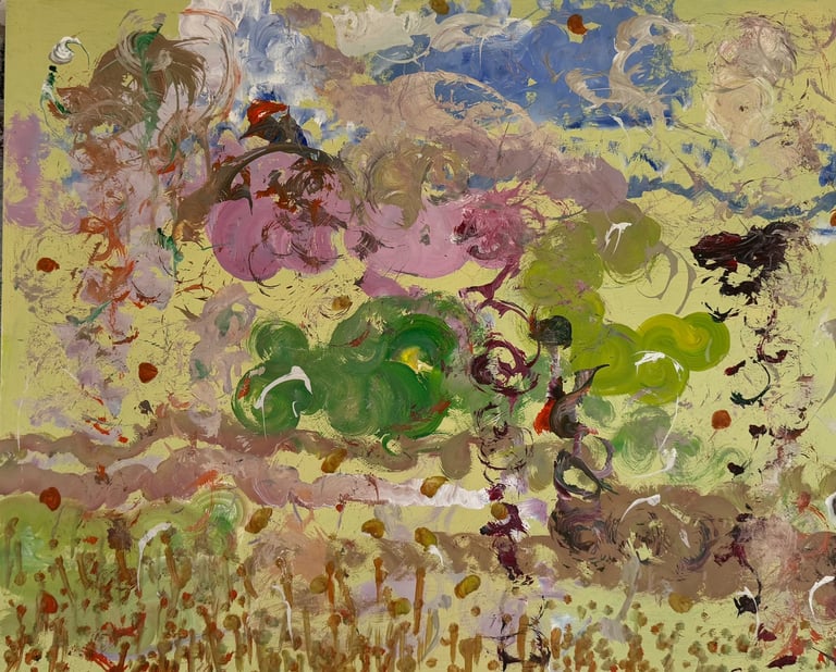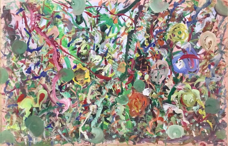 Over the past few years, I have begun to apply this practice of time-limited painting to improvisational music in my personal artmaking outside of work. While I sometimes listen to music I have selected because of its improvisational nature, I most enjoy painting with improvisational musicians in real life and am always in search of collaborative opportunities with such artists. When I paint to music I am familiar with, I can focus on the rhythm and beat, but it is most exciting and interesting for me to paint to music I have never listened to before, because of the unknown, unanticipated nature of where the music is going. The added benefit of live collaboration is how my painting can also influence the music I am hearing. In 2024, I began teaching workshops and classes on "Expressive Painting to Music" with my musician colleague and friend, David Smith, at the Arkansas Museum of Fine Arts. This improvisational “paint to music” practice is a form of meditation for me. It helps me to overcome the distraction of my thoughts and my constant concern about the problems of the complex world we live in. When I am making these pieces, I am completely in the moment, responding to what I hear. This practice has given me a new way to express my creative impulses.
