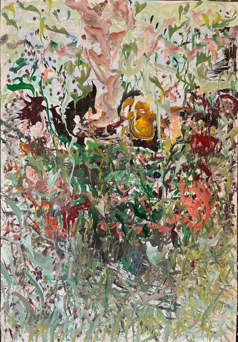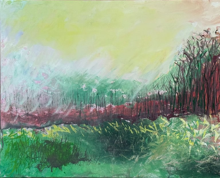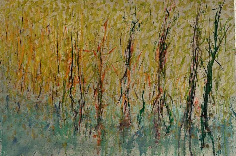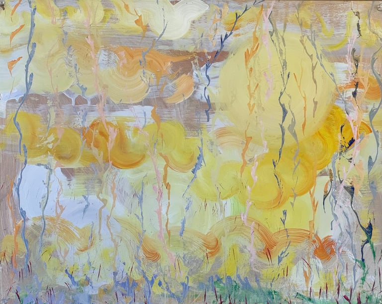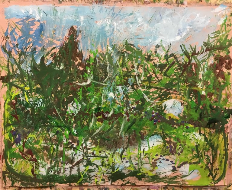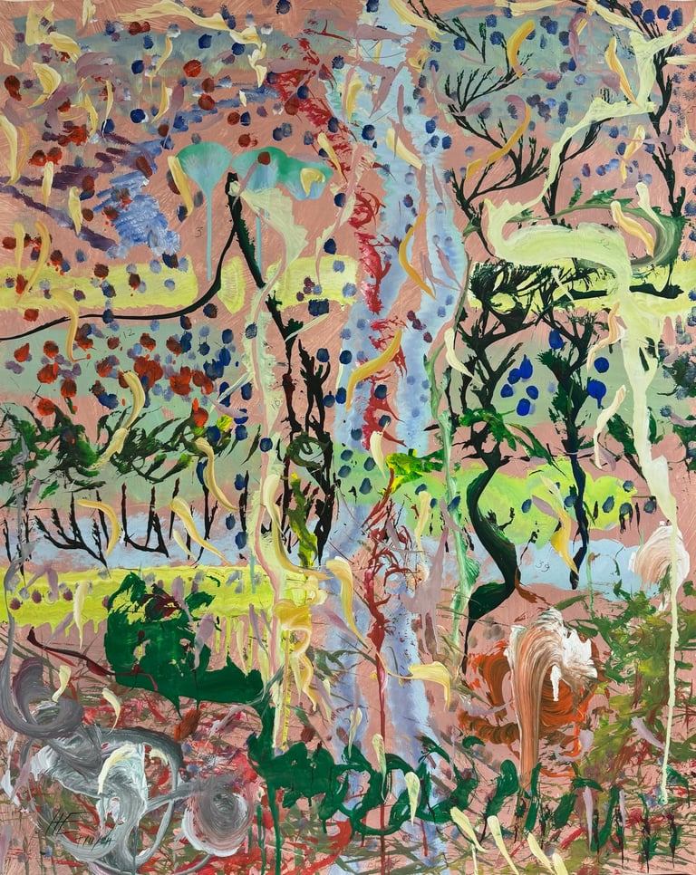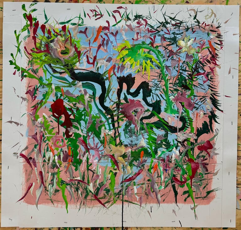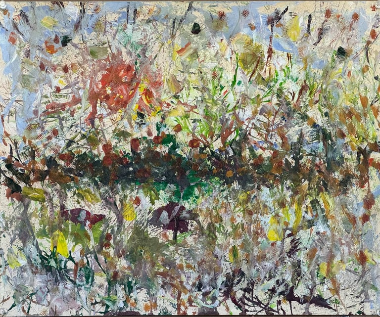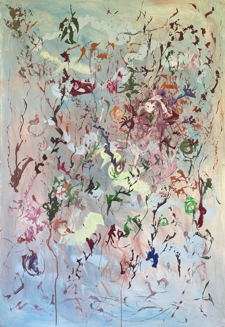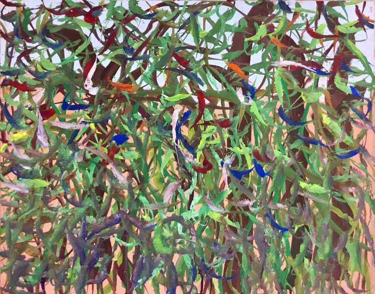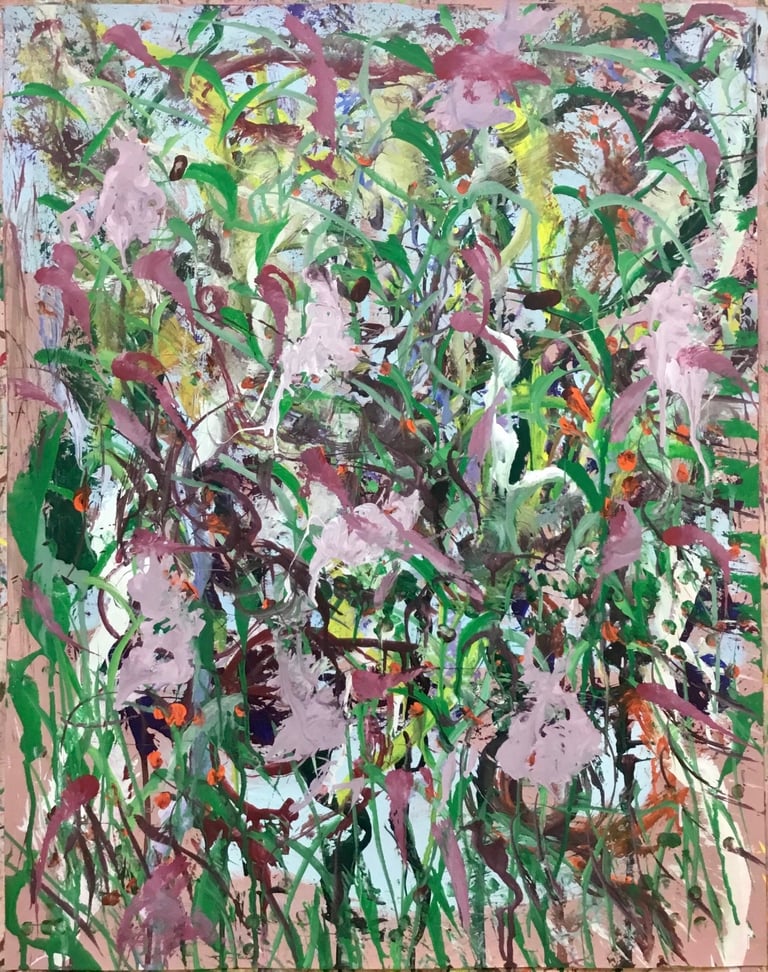 Over the past few years, I have begun to apply this practice of time-limited painting to improvisational music in my personal artmaking outside of work. While I sometimes listen to music I have selected because of its improvisational nature, I most enjoy painting with improvisational musicians in real life and am always in search of collaborative opportunities with such artists. When I paint to music I am familiar with, I can focus on the rhythm and beat, but it is most exciting and interesting for me to paint to music I have never listened to before, because of the unknown, unanticipated nature of where the music is going. The added benefit of live collaboration is how my painting can also influence the music I am hearing. In 2024, I began teaching workshops and classes on "Expressive Painting to Music" with my musician colleague and friend, David Smith, at the Arkansas Museum of Fine Arts. This improvisational “paint to music” practice is a form of meditation for me. It helps me to overcome the distraction of my thoughts and my constant concern about the problems of the complex world we live in. When I am making these pieces, I am completely in the moment, responding to what I hear. This practice has given me a new way to express my creative impulses.
