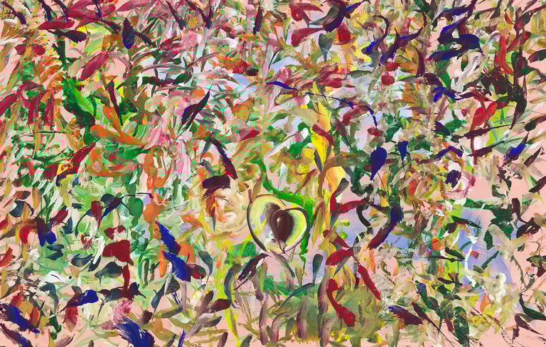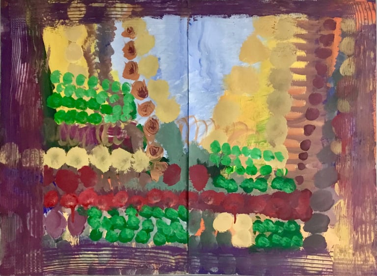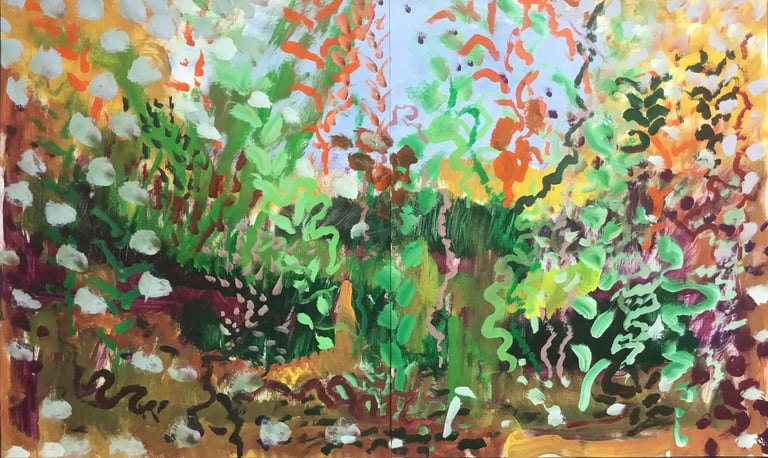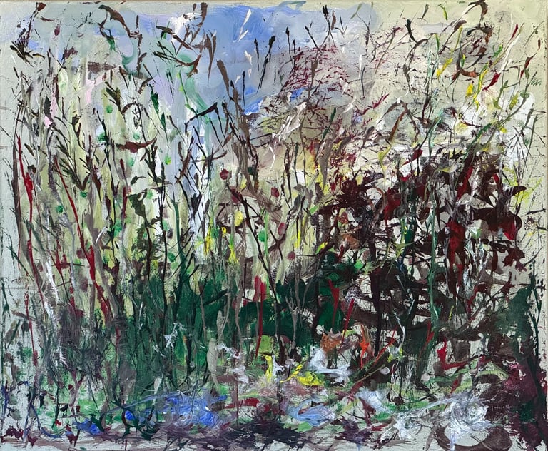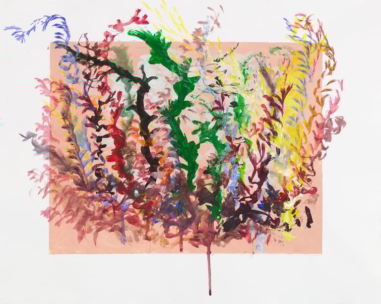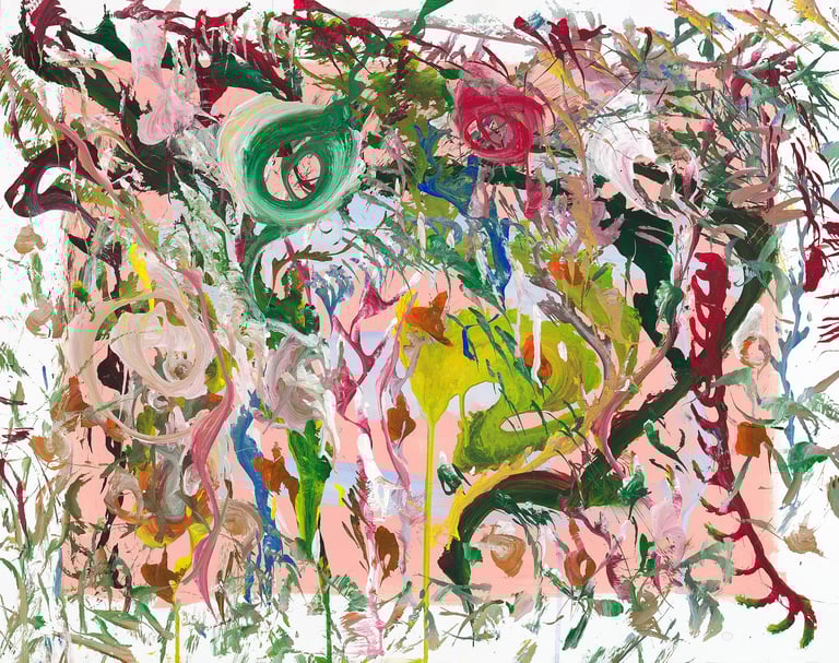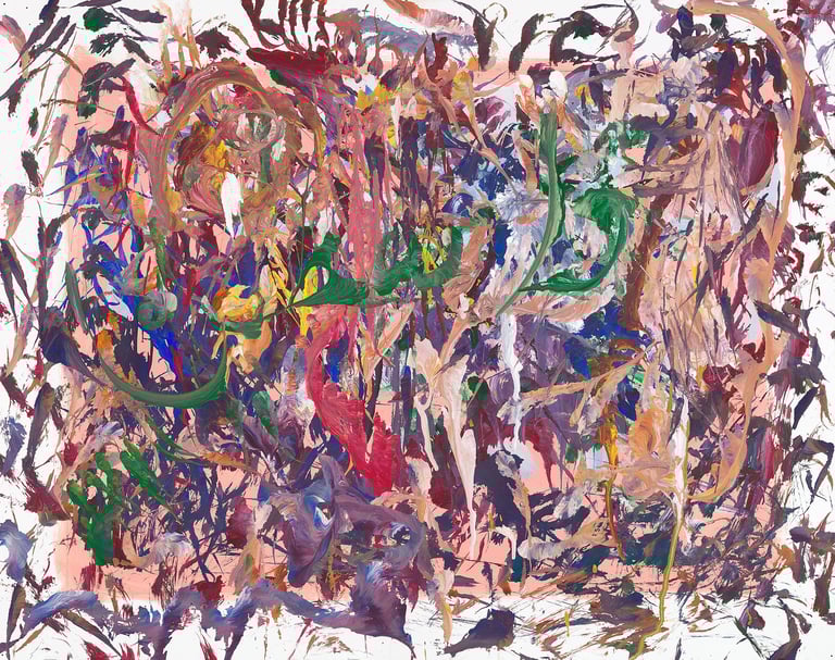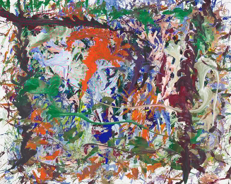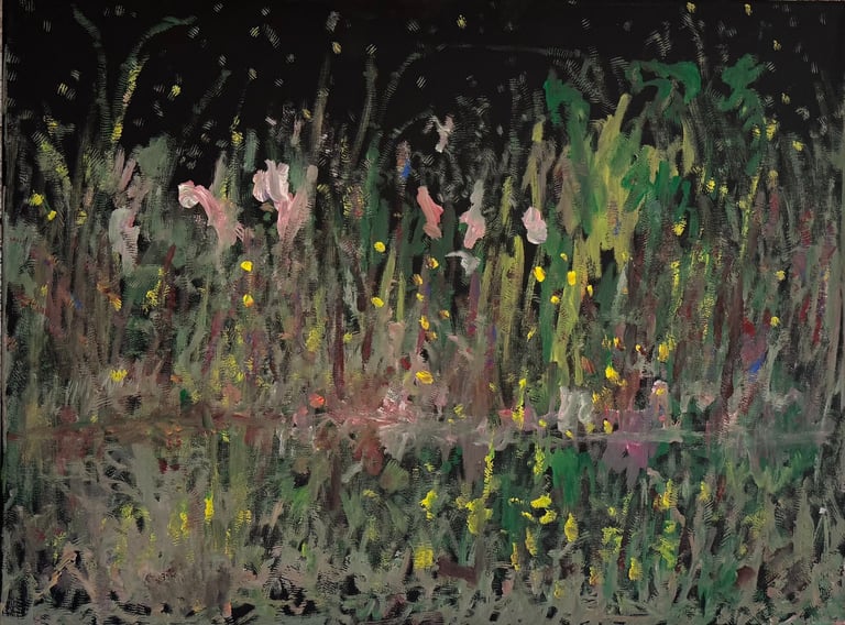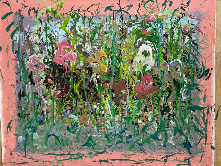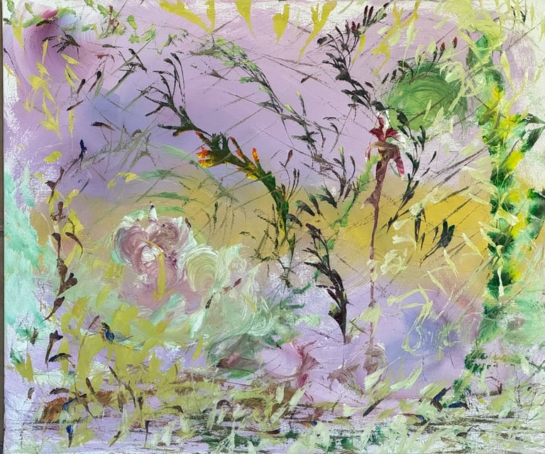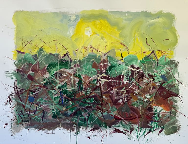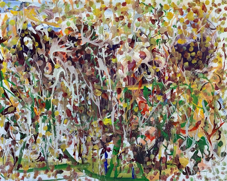 Over the past few years, I have begun to apply this practice of time-limited painting to improvisational music in my personal artmaking outside of work. While I sometimes listen to music I have selected because of its improvisational nature, I most enjoy painting with improvisational musicians in real life and am always in search of collaborative opportunities with such artists. When I paint to music I am familiar with, I can focus on the rhythm and beat, but it is most exciting and interesting for me to paint to music I have never listened to before, because of the unknown, unanticipated nature of where the music is going. The added benefit of live collaboration is how my painting can also influence the music I am hearing. In 2024, I began teaching workshops and classes on "Expressive Painting to Music" with my musician colleague and friend, David Smith, at the Arkansas Museum of Fine Arts. This improvisational “paint to music” practice is a form of meditation for me. It helps me to overcome the distraction of my thoughts and my constant concern about the problems of the complex world we live in. When I am making these pieces, I am completely in the moment, responding to what I hear. This practice has given me a new way to express my creative impulses.