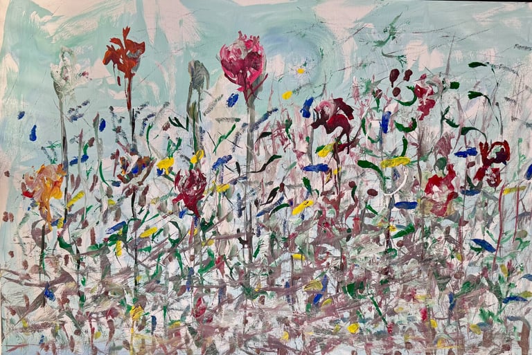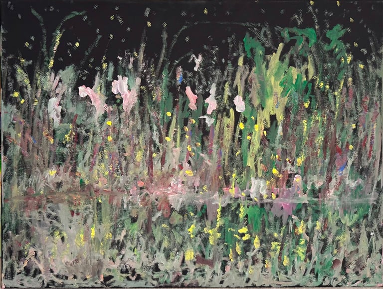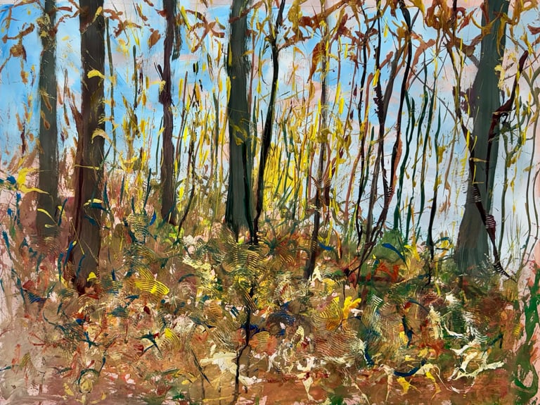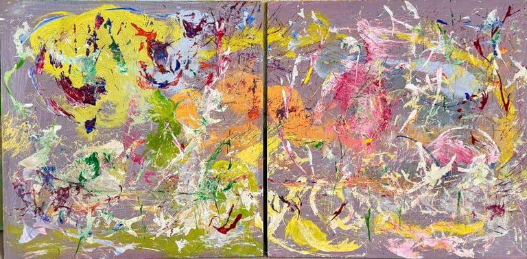 Over the past few years, I have begun to apply this practice of time-limited painting to improvisational music in my personal artmaking outside of work. While I sometimes listen to music I have selected because of its improvisational nature, I most enjoy painting with improvisational musicians in real life and am always in search of collaborative opportunities with such artists. When I paint to music I am familiar with, I can focus on the rhythm and beat, but it is most exciting and interesting for me to paint to music I have never listened to before, because of the unknown, unanticipated nature of where the music is going. The added benefit of live collaboration is how my painting can also influence the music I am hearing. In 2024, I began teaching workshops and classes on "Expressive Painting to Music" with my musician colleague and friend, David Smith, at the Arkansas Museum of Fine Arts. This improvisational “paint to music” practice is a form of meditation for me. It helps me to overcome the distraction of my thoughts and my constant concern about the problems of the complex world we live in. When I am making these pieces, I am completely in the moment, responding to what I hear. This practice has given me a new way to express my creative impulses.